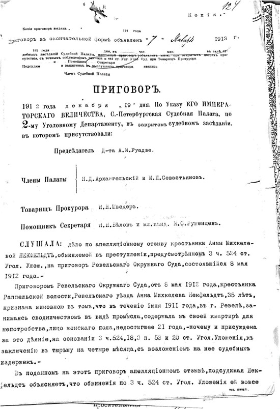 Multiple witness statements attested to the fact that wealthy middle-aged men, including engineers and city council members, regularly frequented Negfeldt’s apartment with the express purpose of engaging in sexual intercourse with teenage girls. One witness, 50-year-old Vilgelm Iakgeim, admitted to regularly having sex with teenagers between the ages of 15-17 at Negfeldt’s apartment. Although technically over the age of consent (between 11-14 years old in the Russian Empire depending on a girl’s ‘sexual innocence’), these girls were too young to be registered legally as prostitutes.[4]
