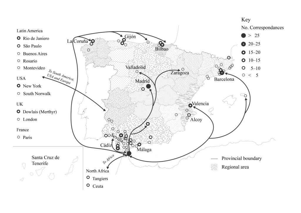 Publishing underwrote every aspect of anarchist practice at this time. Almost 300 titles were launched by anarchist groups in Spain from 1890-1915, who published around 7,300 issues between them. Every sizeable population produced a paper in this period, from Cádiz on the southern coast to Irún on the Basque-French border, and La Coruña on the Atlantic north to Valencia on the Mediterranean [map 1]. Anarchist print was distributed to every corner of Spain, where correspondents would hand out papers or read to their illiterate comrades, and relate the affairs of their locality in letters back to the publishers, many of which would then be published in future issues [map 2].