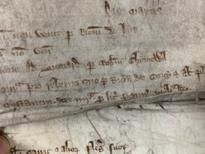 As part of the Beyond 2022 Project at Trinity College Dublin, I’m part of a team gathering together the surviving materials from the Public Record Office of Ireland and putting them back on the virtual shelves of the Record Treasury. My role is to edit those surviving documents in London, translate them from Latin and make them searchable. Instead of having to learn Latin and learn how to untangle the format of the records, you’ll be able to search our translation and look at images of the originals online. You’ll be able to find stories about people and places in medieval Ireland. It’s unlikely that many people will find their ancestors, simply because it is so far back. Although if your surname is Constantine or Constantin, you might just be able to work out if you are related to people whose names are in this photo, where Lucy, the widow of George Constantin pays for a licence, hidden in the margin of an Irish record.